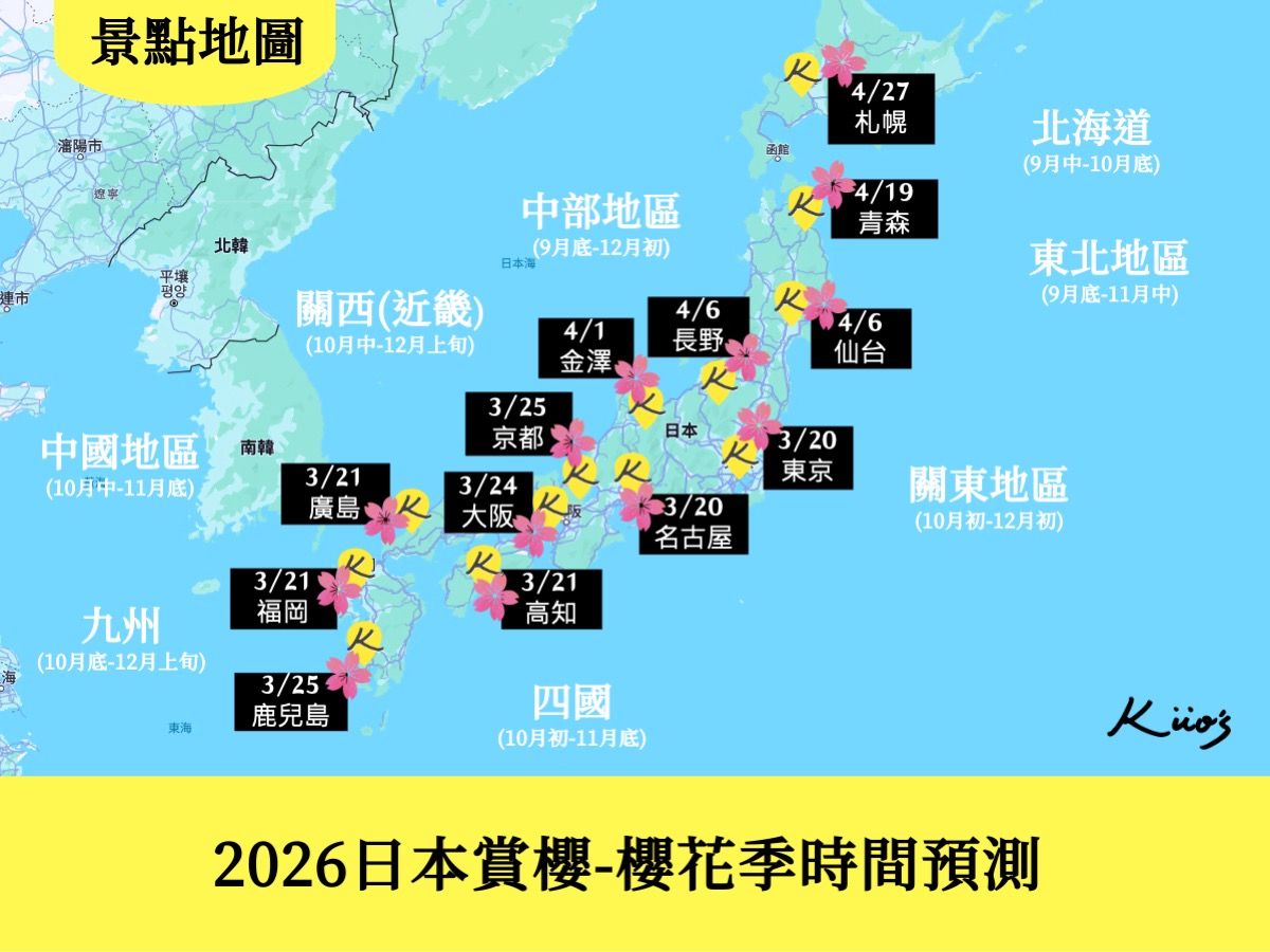 | 特別注意:大家可參照2025年日本櫻花開花時間來推測安排2026年的賞櫻行程,不過今年賞櫻時間可能會因氣候而有所變動,需待日本Weathernews公布最新櫻花季狀況,才會更確切喔! KUO也會持續幫大家密切關注,2026櫻花花期預測將陸續更新到最新! 推薦使用日本櫻花導航來關注日本700個地區櫻花盛開狀況! | ||||